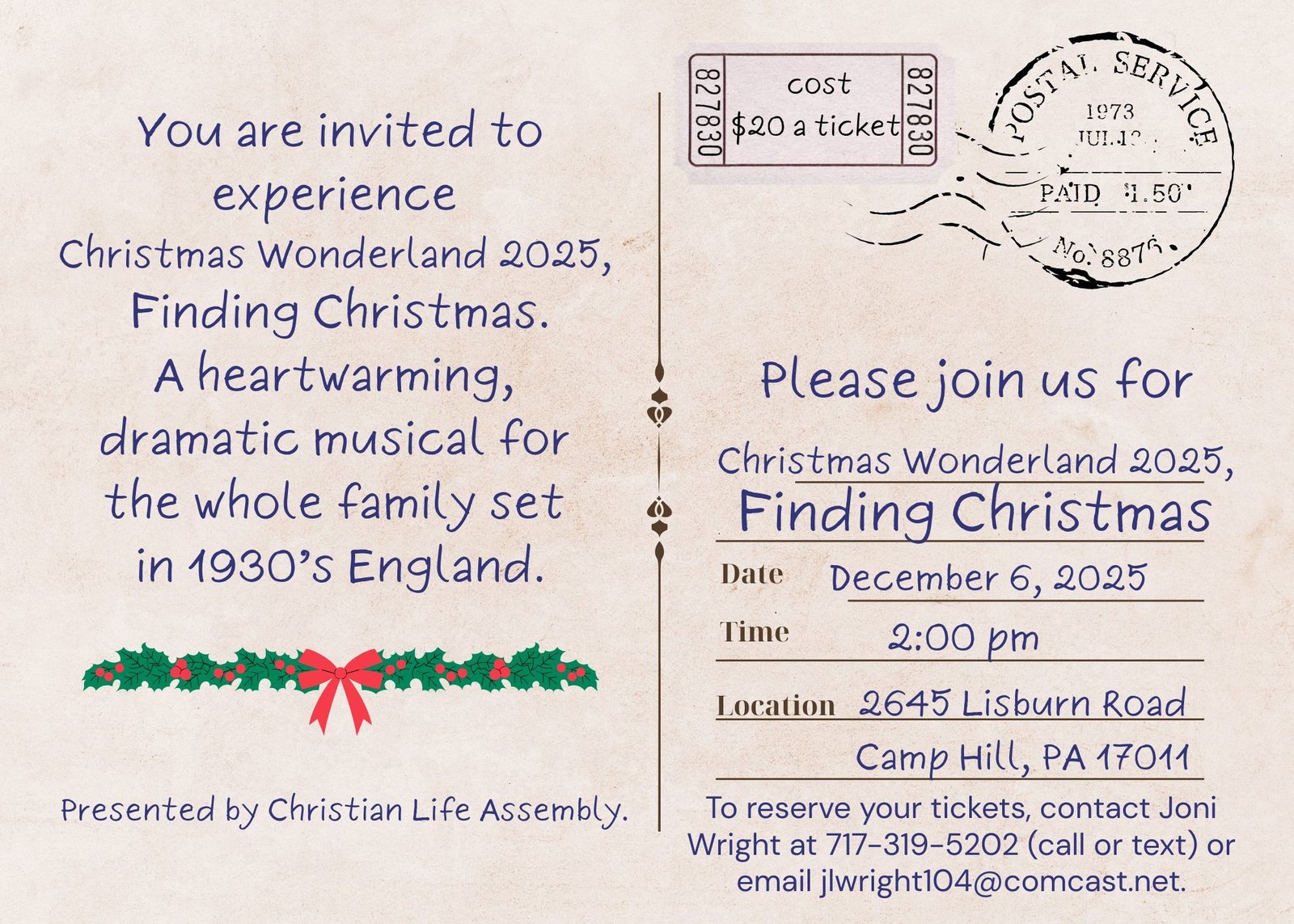 Come join St. Thomas as we attend the “Christmas Wonderland – Finding Christmas” show at Christian Life Assembly Church. This show was spectacular last year, so we plan to go again this year.  Ticket orders must be in buy October 5th